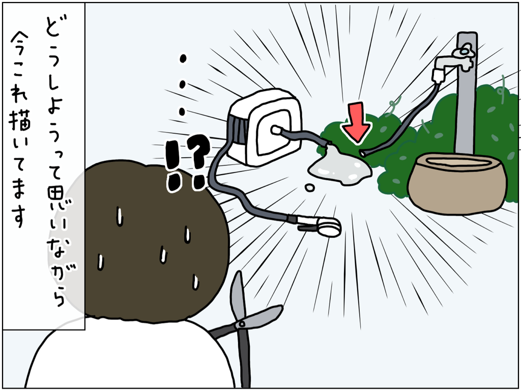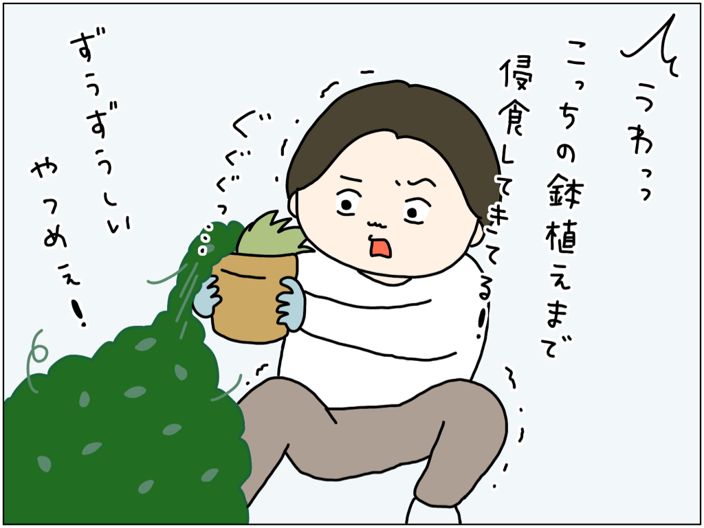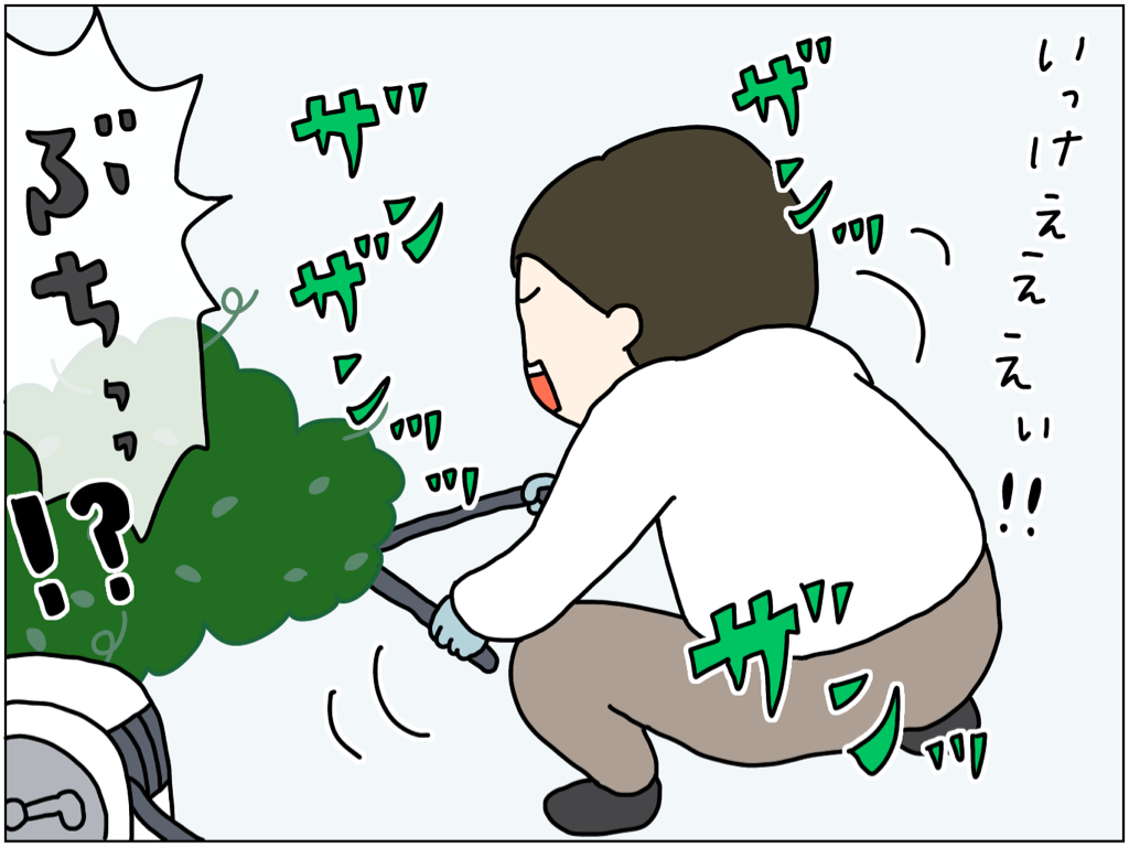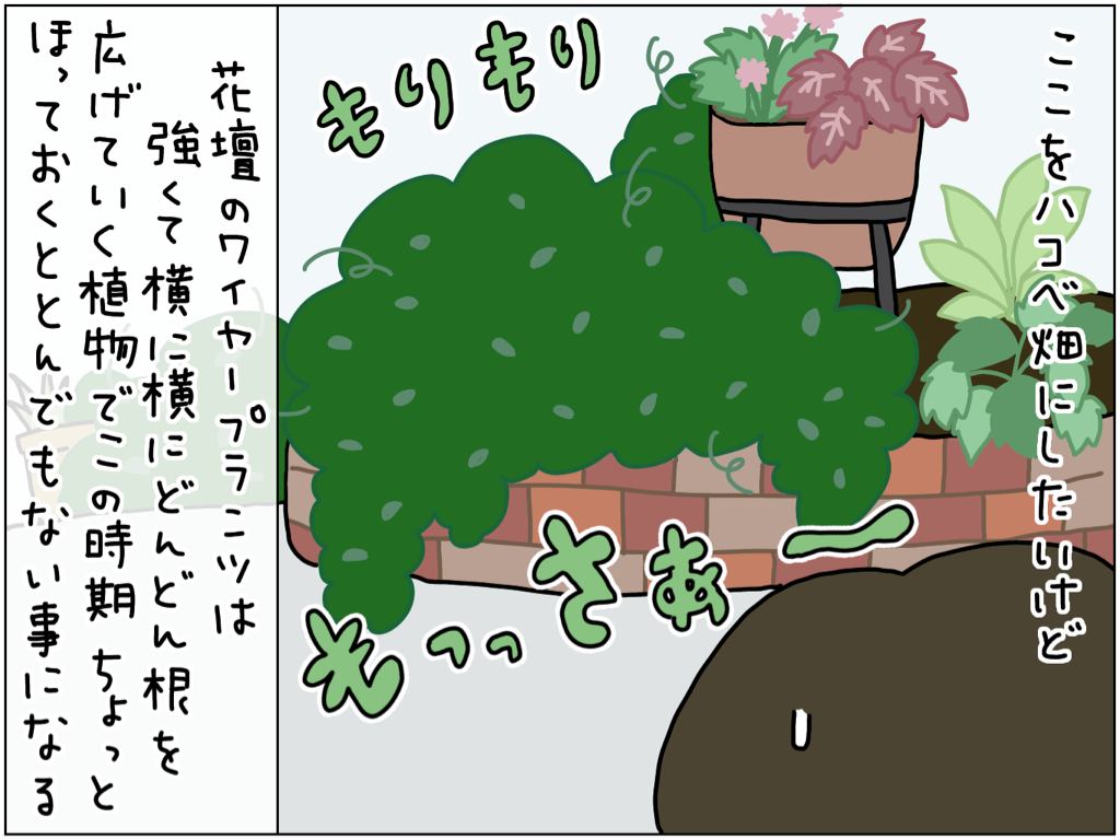 ぶきっちょが手探りでハサミを振り回した結果 2023年06月26日 21:14 あーあぁ。どうしよ。外は暑いし、ホースは切れるし、このあとでデッキブラシの頭までもげてやる気を失い一旦部屋に戻って来て先にブログを書くことにしました。ワイヤープランツは小さい葉っぱと赤茶色の茎がとてもきれいな植物で冬でも花壇を華やかにボリュームアップしてくれるので好きなのですが、この季節の成長具合は本当にすごい。どこにでも音を伸ばして広がるのでちょっと怖いくらいです。 「絵日記」カテゴリの最新記事 < 前の記事次の記事 > コメント コメントフォーム 名前 コメント 記事の評価 リセット リセット 顔 星 情報を記憶 コメントを投稿する